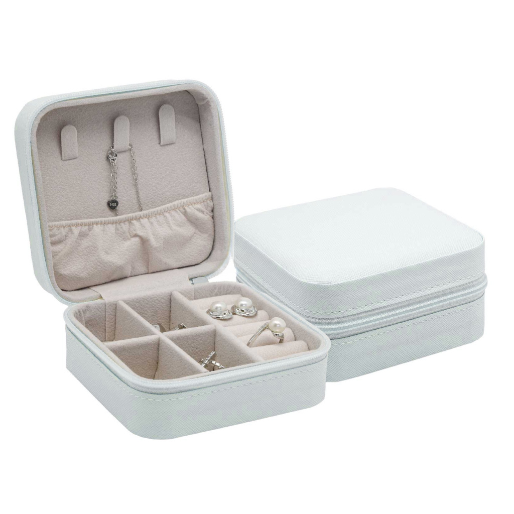 Menší cestovní šperkovnice se zapínáním na zip potažená bílou koženkou.