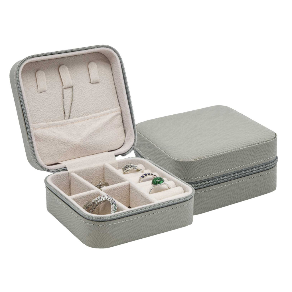 Menší cestovní šperkovnice se zapínáním na zip potažená šedou koženkou.