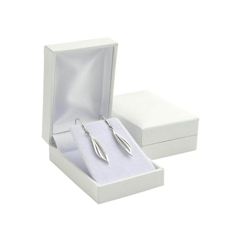 Dárková krabička na náušnice potažená bílou koženkou. Vnitřek krabičky je potažen bílým sametem.