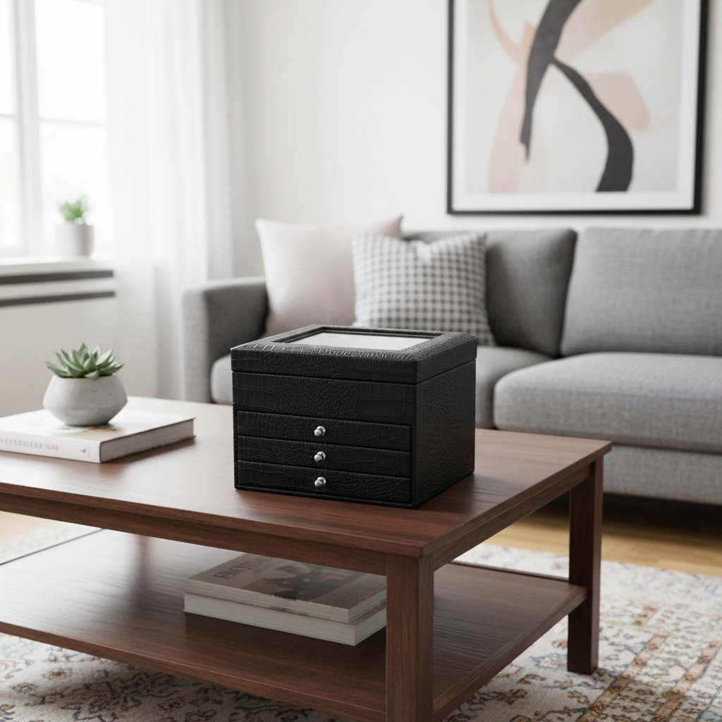 Čtyřpatrová koženková šperkovnice v černé barvě s krokodýlím vzorem. Šperkovnice obsahuje tři různě dělené šuplíky, horní patro obsahuje volné přihrádky a část pro prsteny. Horní část šperkovnice je prosklená.