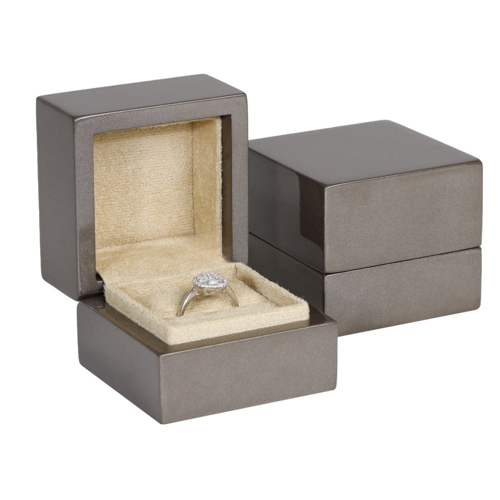 Luxusní lakovaná krabička na prsten vyrobená ze dřeva šedohnědé barvy. Vnitřek krabičky je potažen světle hnědým sametem.