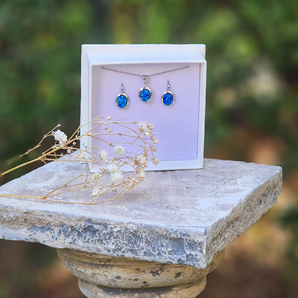 Elegantní stříbrná souprava s rhodiovanou povrchovou úpravou dekorovaná oválným modrým syntetickým opálem o rozměru 6x8 mm.