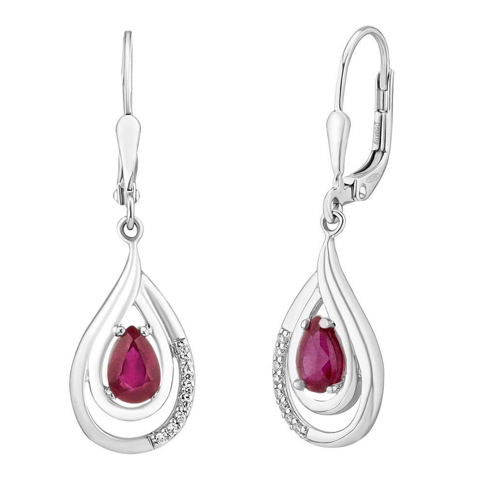 Elegantní stříbrná souprava šperků ve tvaru kapky s rhodiovanou povrchovou úpravou ozdobená červeným přírodním rubínem a čirými třpytivými zirkony.