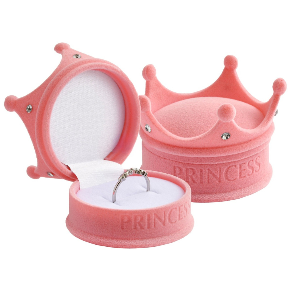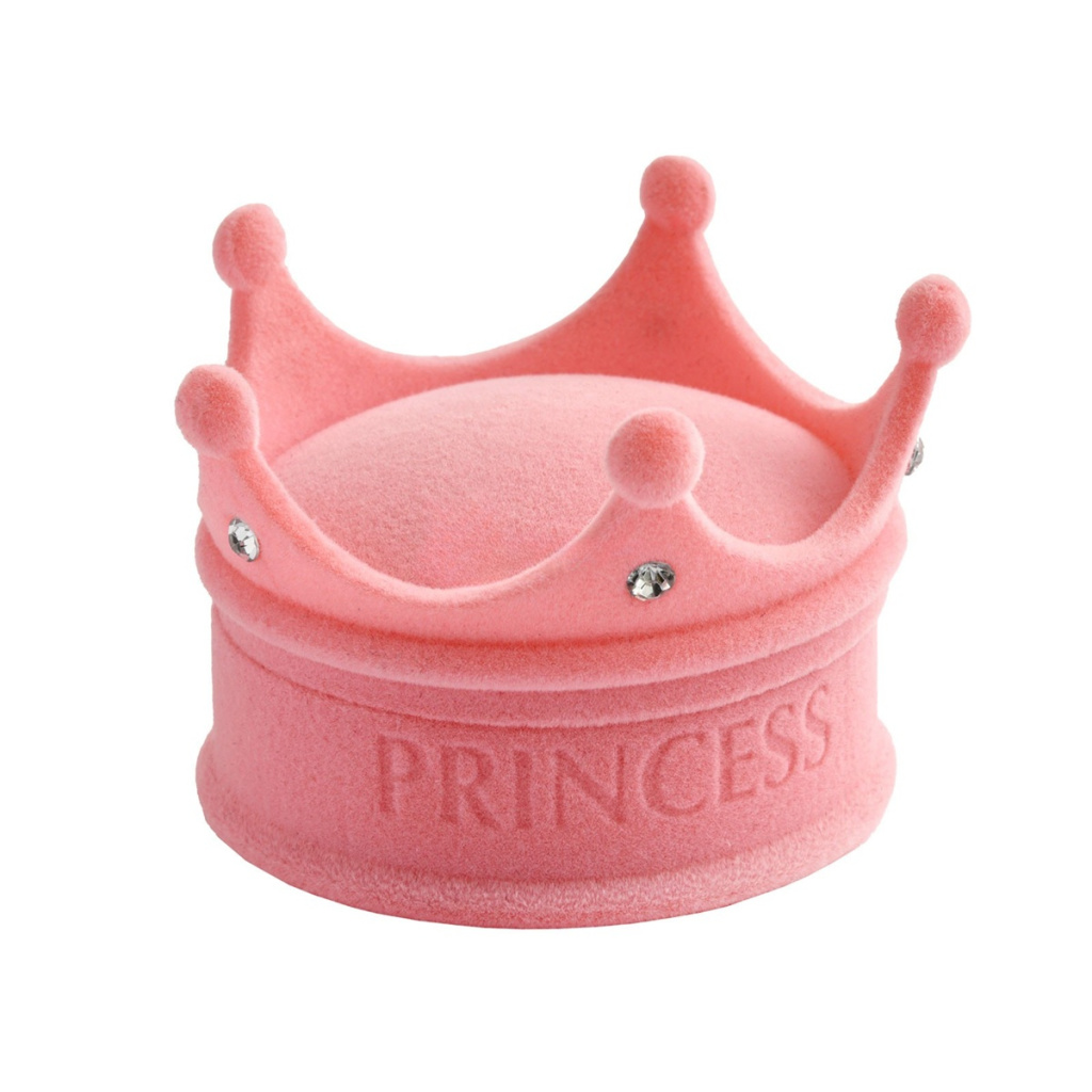 Sametová dárková krabička ve tvaru korunky pro princeznu v růžové barvě určená pro prsten nebo náušnice pecky. Vnitřek je potažen bílým sametem.