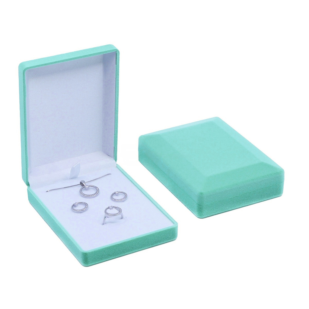 Sametová dárková krabička v zelené barvě určená pro soupravu šperků. Vnitřek je potažen bílým sametem.