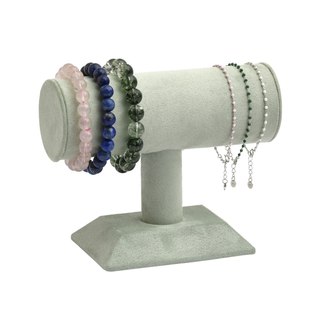 Stojan potažený sametem pastelově zelené barvy určený na náramky nebo hodinky.
