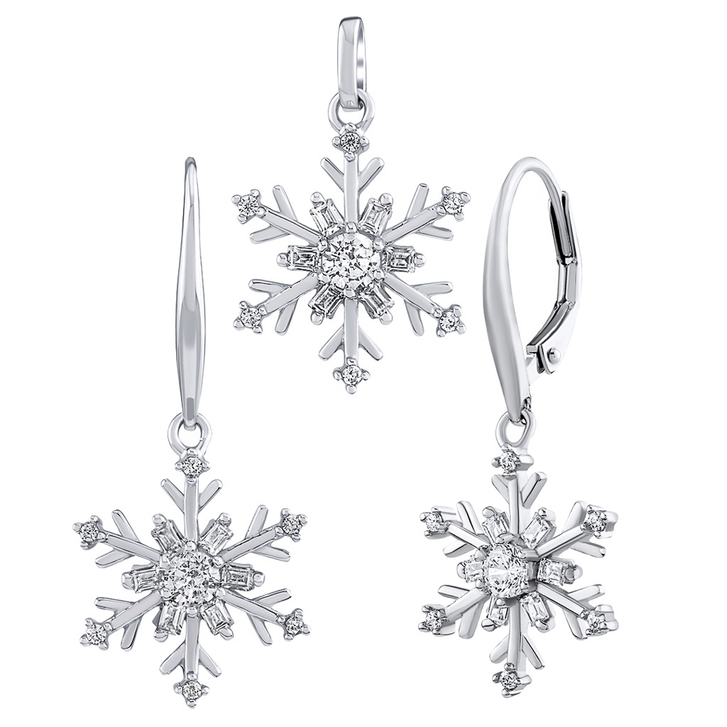 Stříbrná třpytivá souprava s rhodiovanou povrchovou úpravou ve tvaru sněhových vloček dekorovaná čirými krystalky.