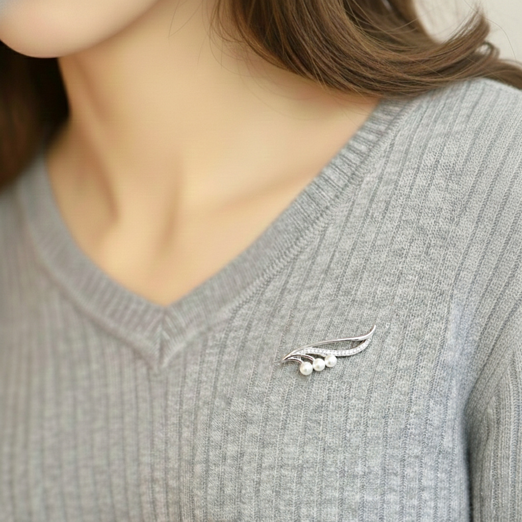Luxusní stříbrná brož zdobená třemi přírodními perleťově bílými perlami a čirými zirkony.