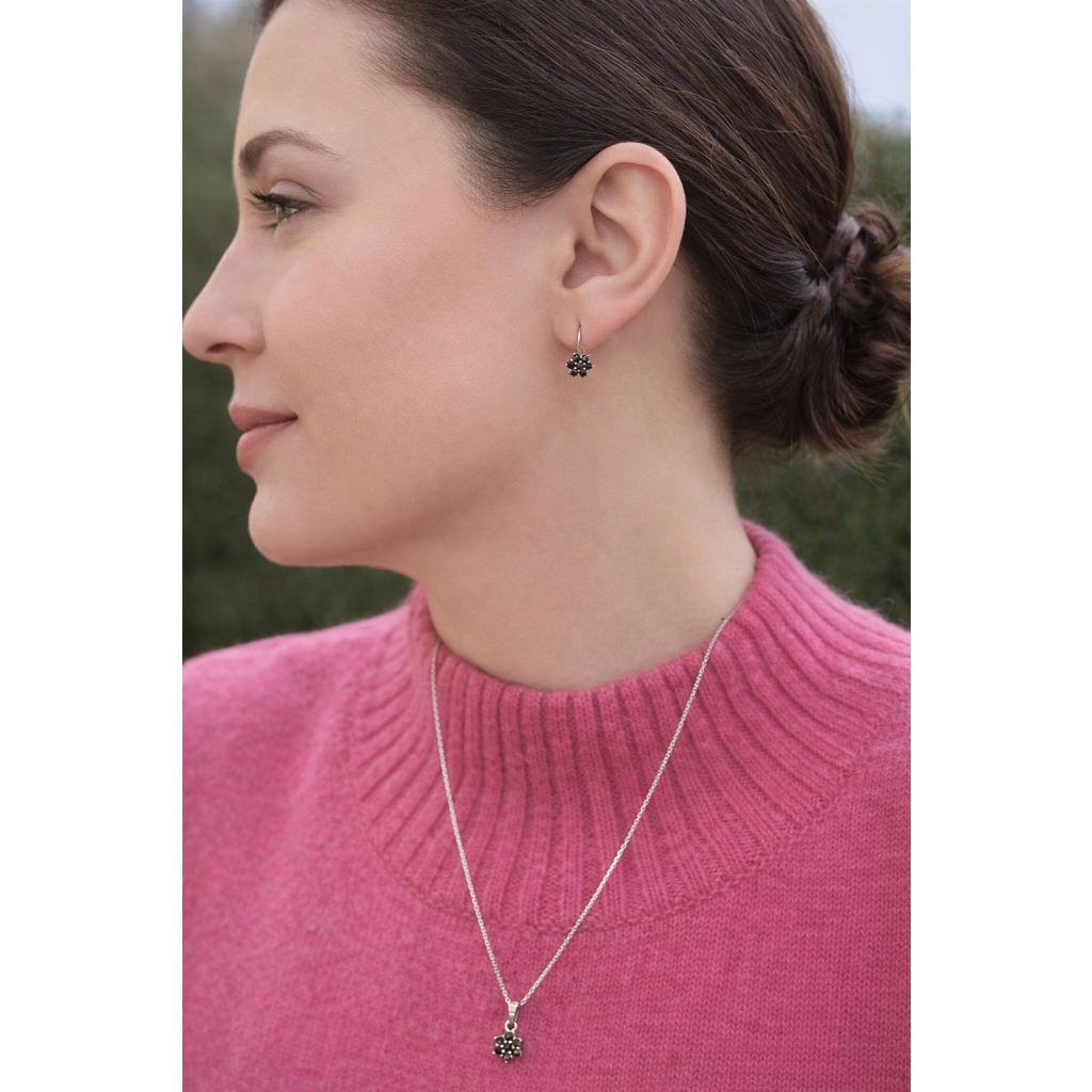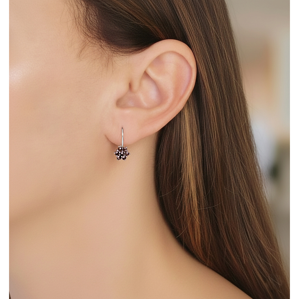 Drobná stříbrná souprava šperků ve tvaru květů s rhodiovanou povrchovou úpravou ozdobená temně červenými broušenými přírodními granáty.