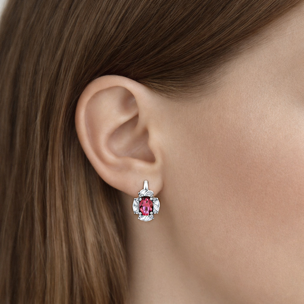 Výrazné stříbrné náušnice s rhodiovanou povrchovou úpravou ozdobené oválným syntetickým rubínem červené barvy a drobnými čirými kamínky kulatého brusu.