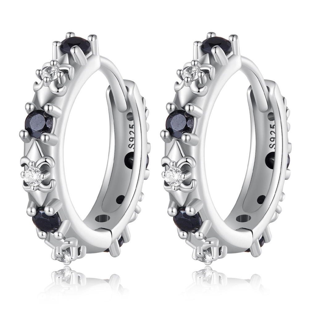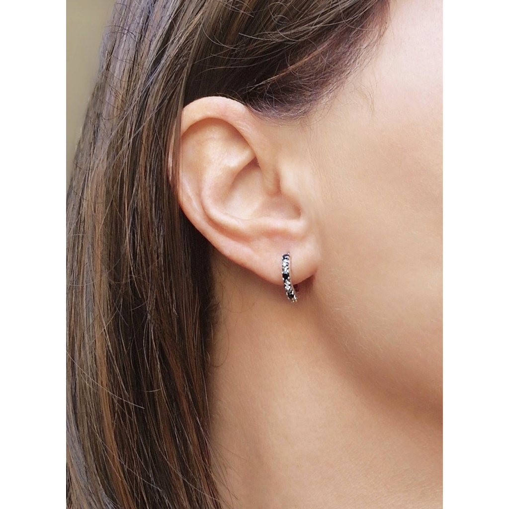 Stříbrné kruhové náušnice s leštěným povrchem zdobené čirými a černými zirkony.