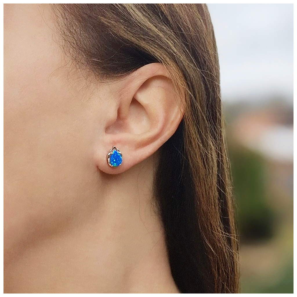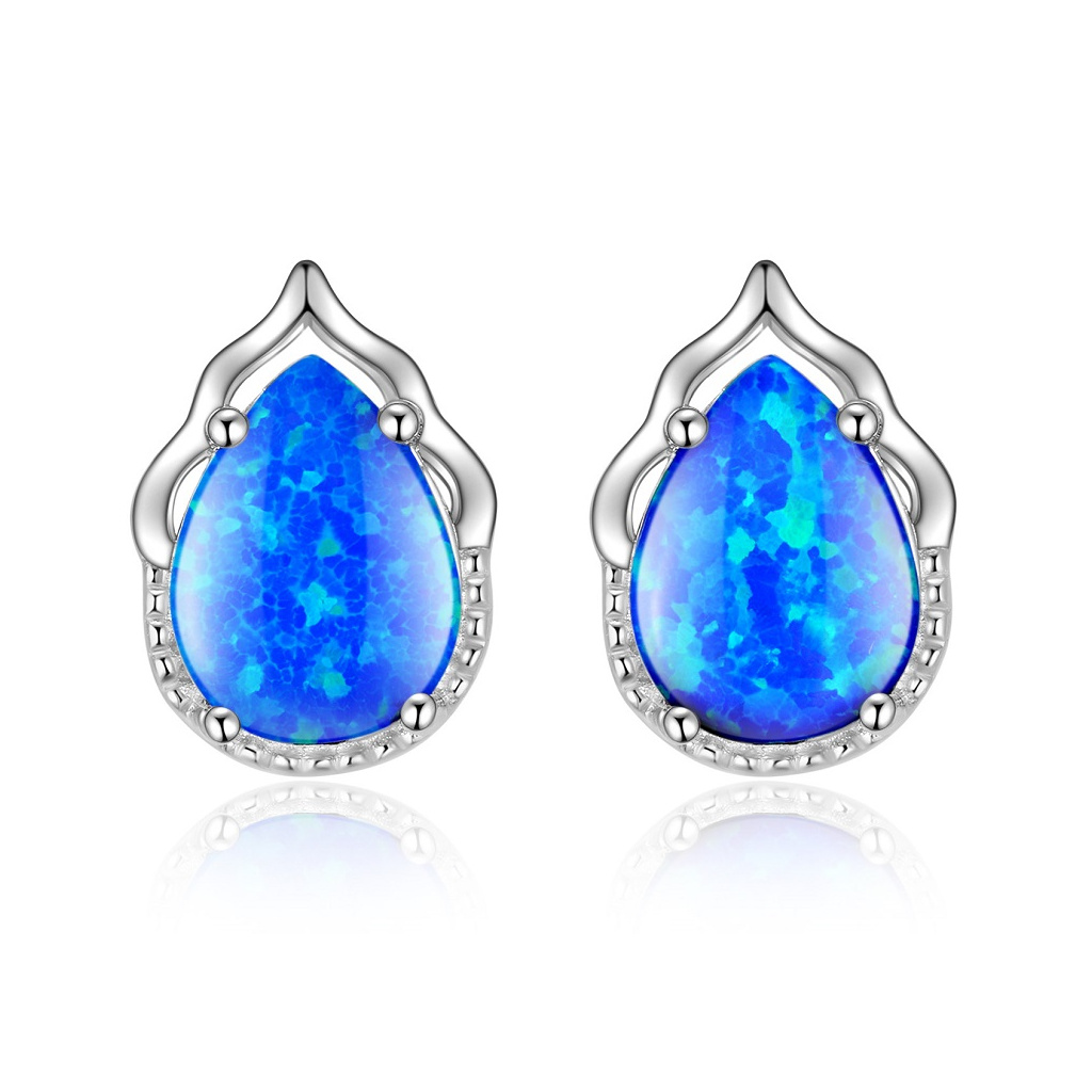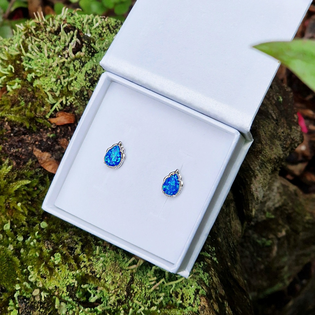 Stříbrné náušnice ve tvaru kapky s rhodiovanou povrchovou úpravou zdobené modrými syntetickými opály.