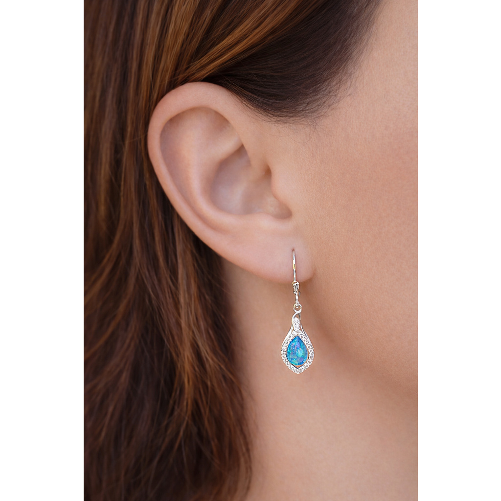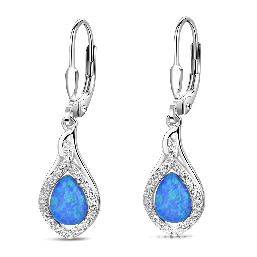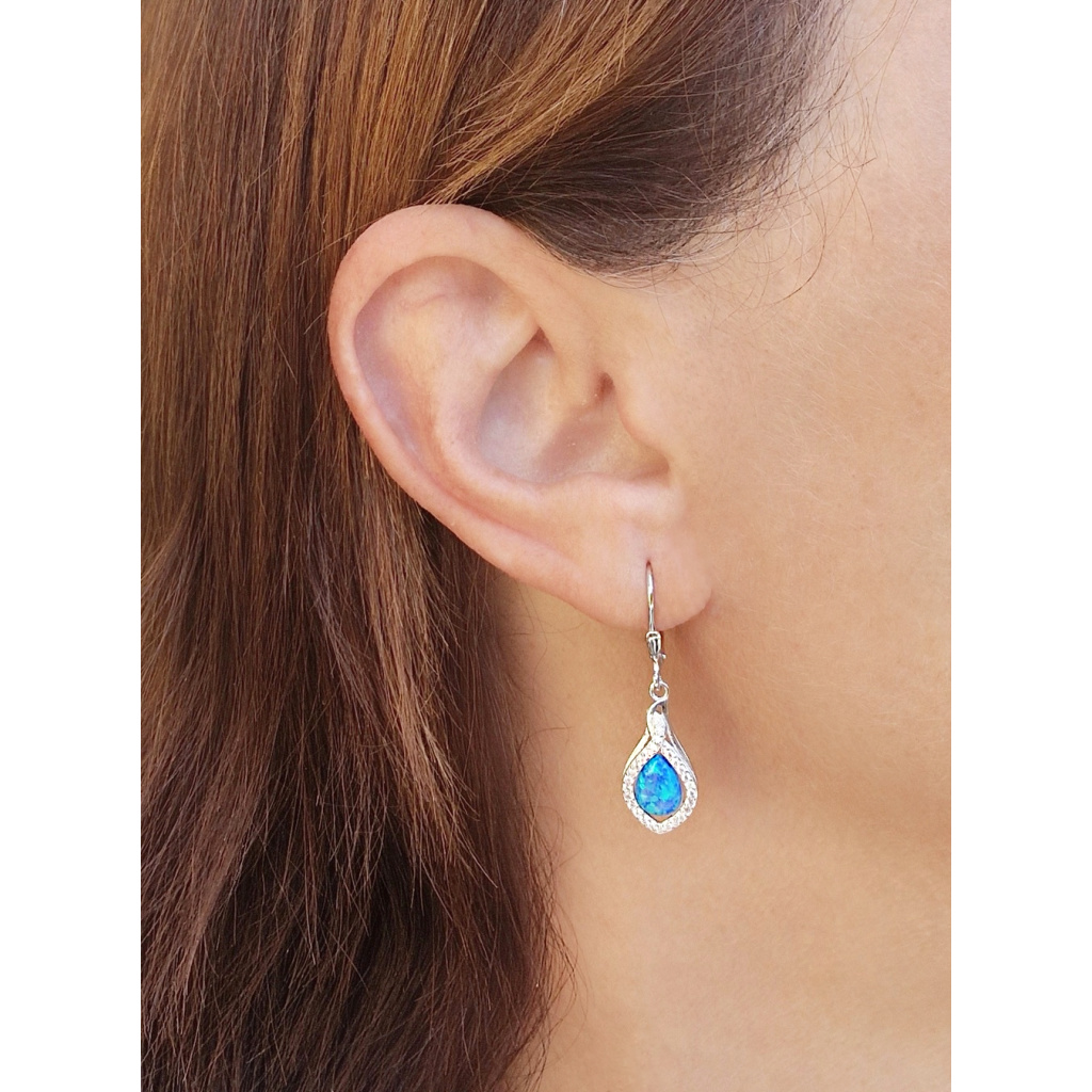 Visací stříbrné náušnice s vysokým leskem a rhodiovanou povrchovou úpravou zdobené jasně modrým syntetickým opálem ve tvaru kapky a drobnými čirými zirkony.