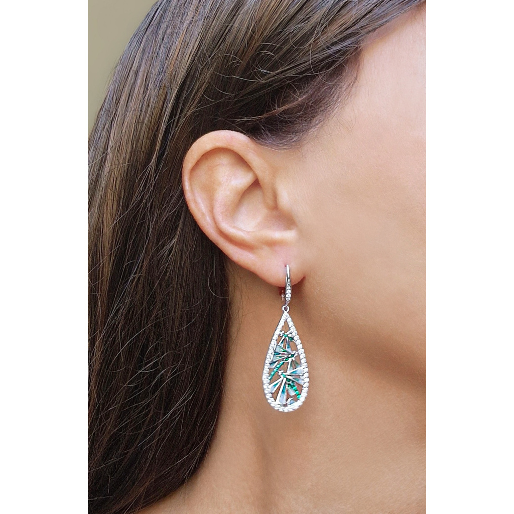 Výrazné stříbrné náušnice s rhodiovanou povrchovou úpravou s motivem vážek z modrého, bílého a zeleného smaltu a drobnými čirými zirkony.