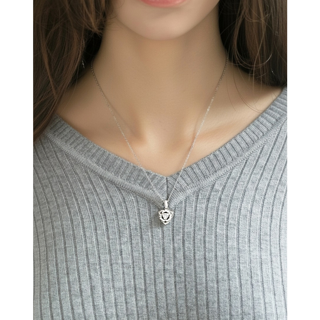 Třpytivý stříbrný náhrdelník s rhodiovanou povrchovou úpravou zdobený čirými zirkony. Přívěsek je zavěšen na jemném očkovém řetízku.
