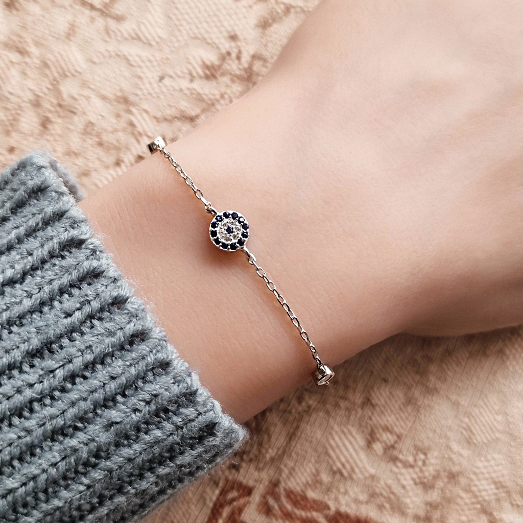 Elegantní stříbrný náramek s rhodiovanou povrchovou úpravou osazený modrými a čirými zirkony.