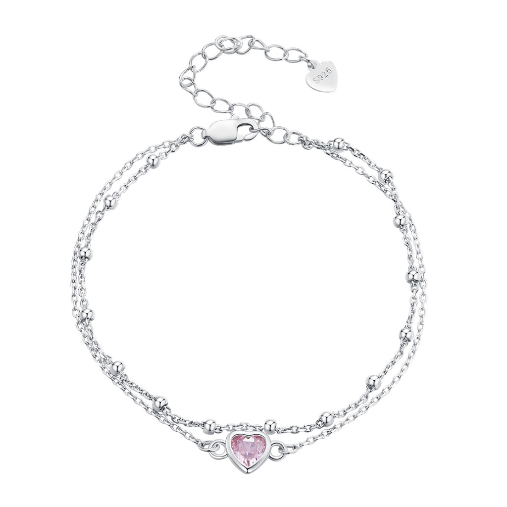 Stříbrný náramek s leštěným povrchem ozdobený srdíčkem z růžového zirkonu. Druhý řetízek zdobí drobné lesklé kuličky.