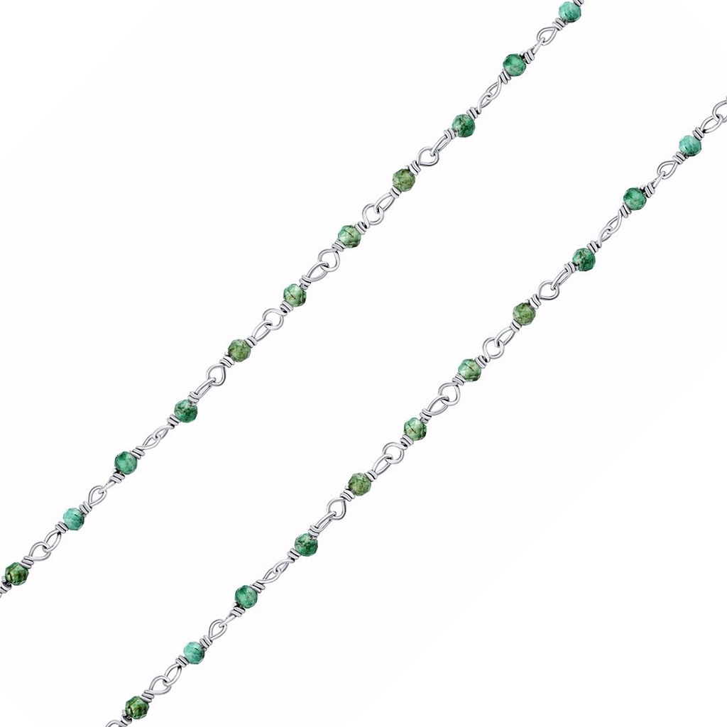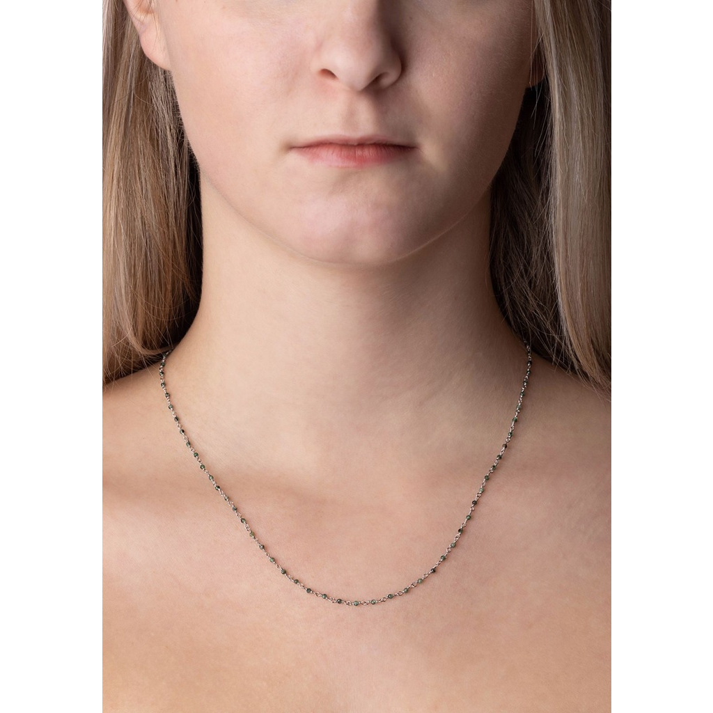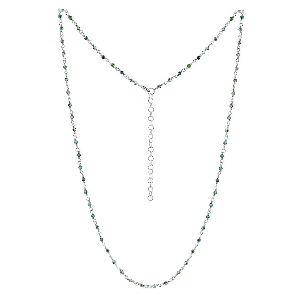 Stříbrný dámský náhrdelník s leštěným rhodiovaným povrchem ozdobený kousky přírodního zeleného smaragdu.