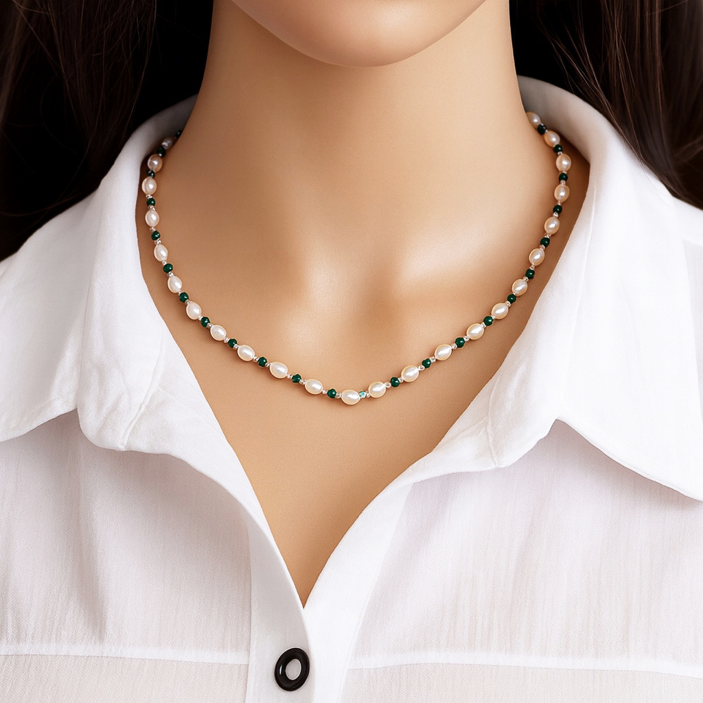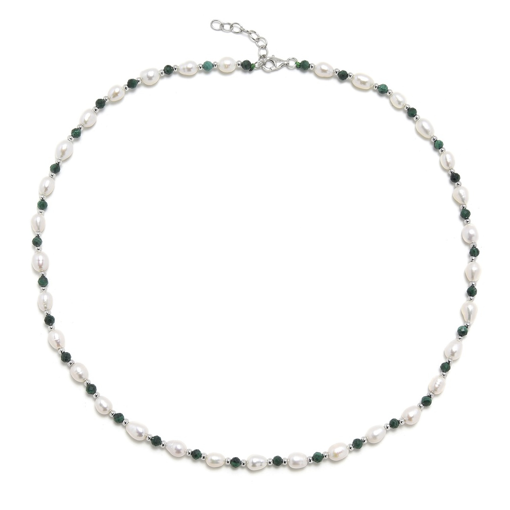 Stříbrný dámský náhrdelník s leštěným rhodiovaným povrchem ozdobený kuličkami přírodního zeleného malachitu a oválnými perleťově bílými perlami. Kameny jsou proloženy drobnými stříbrnými kuličkami.