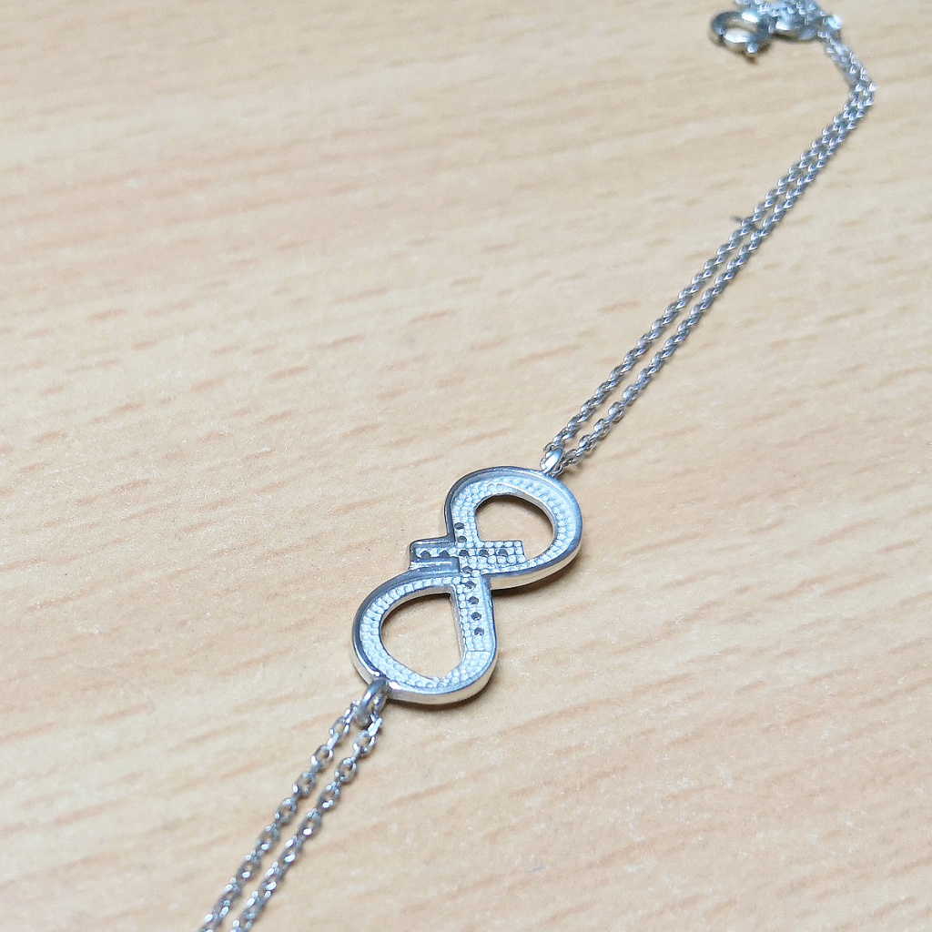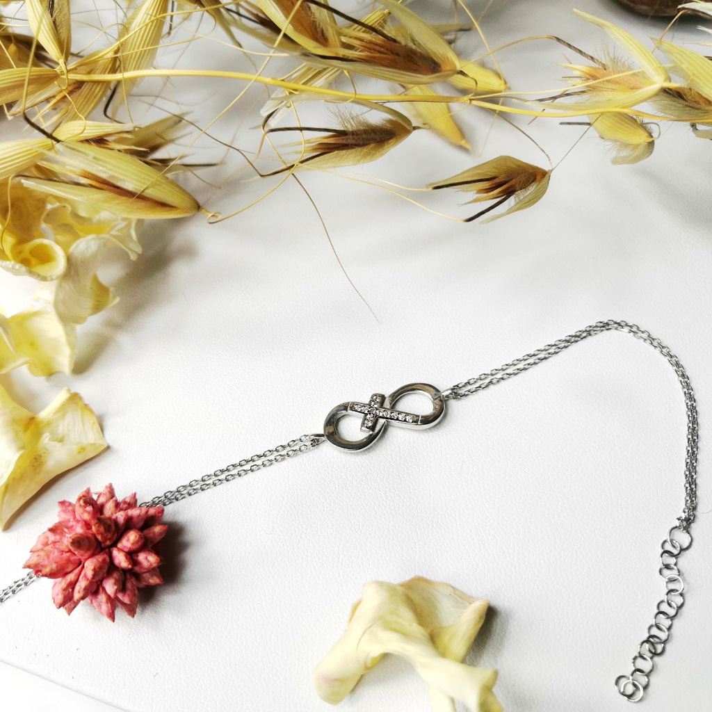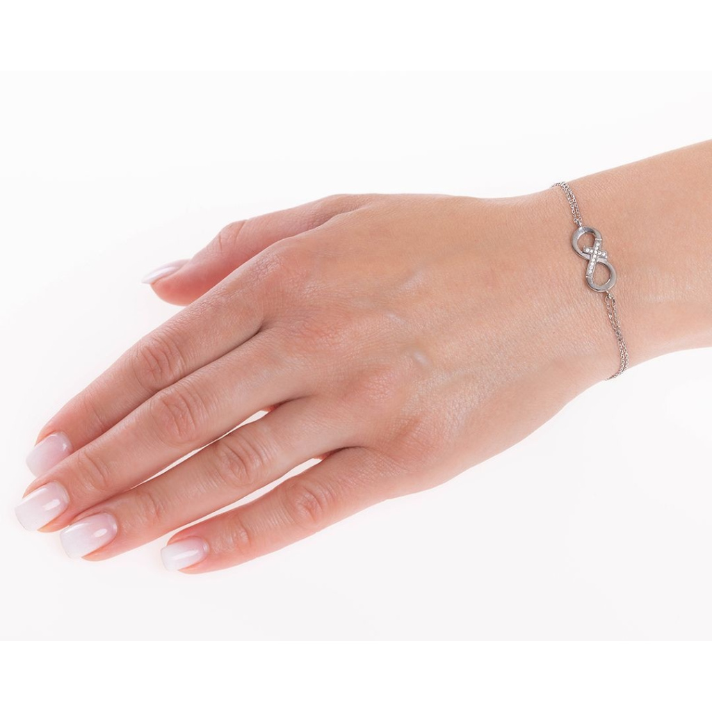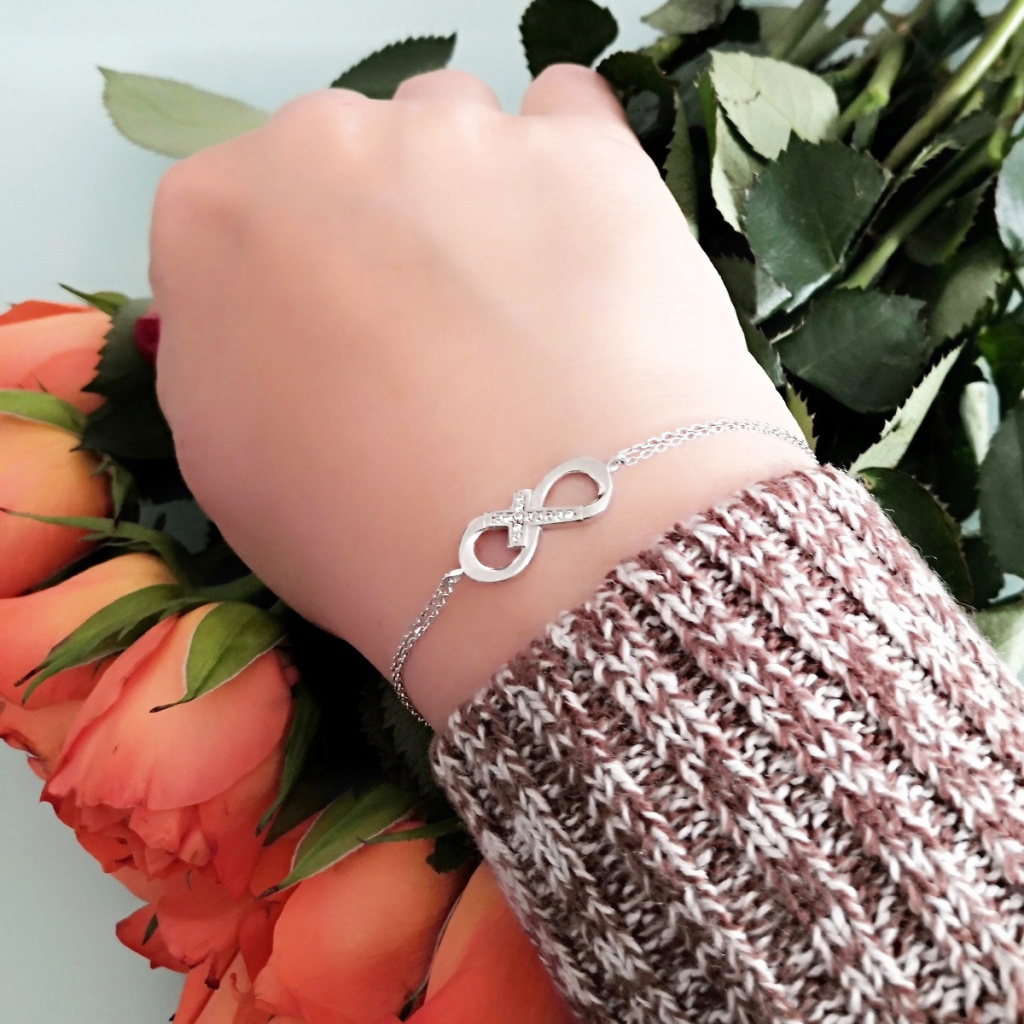Stříbrný rhodiovaný náramek s leštěným povrchem složený z jemného dvojitého řetízku a přívěsku v oblíbeném tvaru znázorňujícím symbol nekonečna. Přívěsek je doplněn o křížek ozdobený drobnými čirými Brilliance Zirconia.