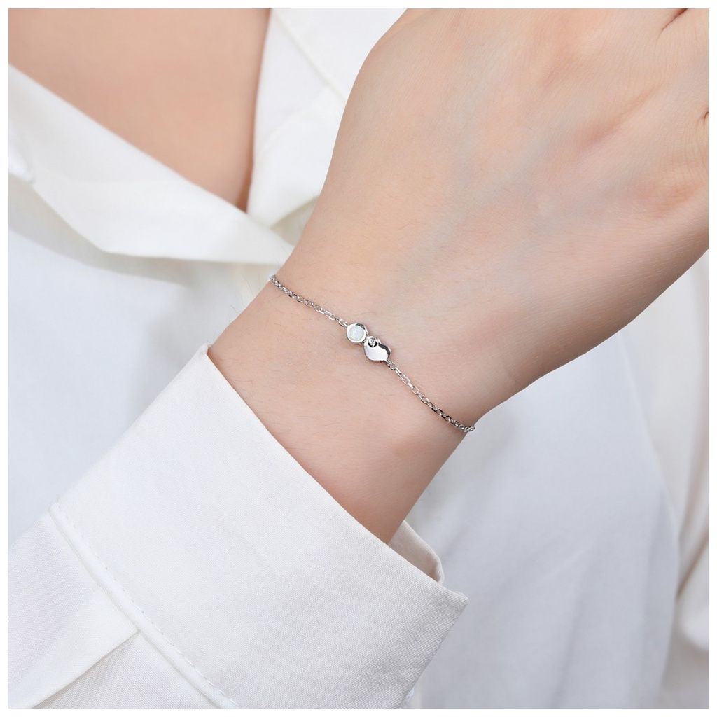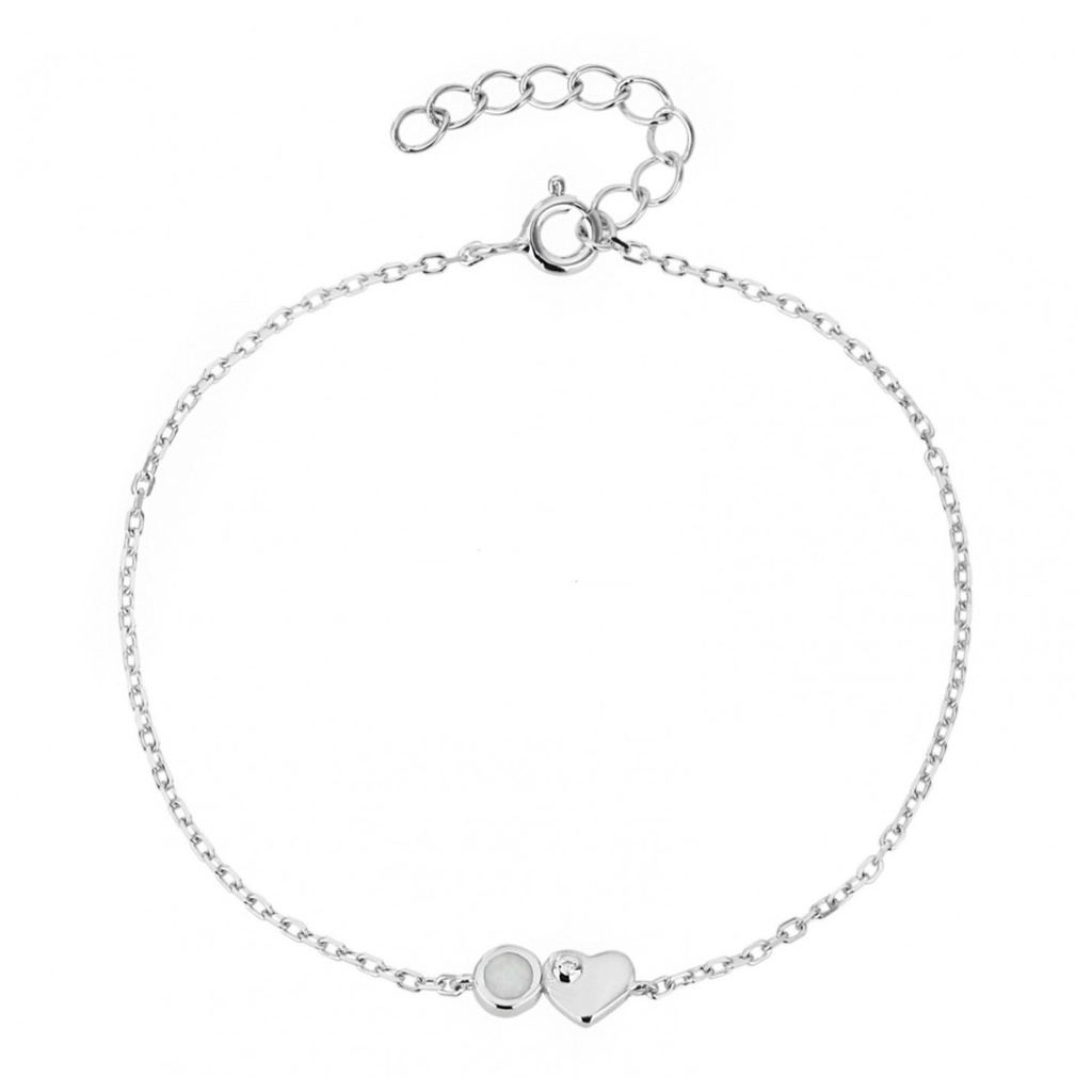 Stříbrný rhodiovaný náramek s leštěným povrchem ozdobený kulatým přívěskem z bílého opálu a drobným srdíčkem se vsazeným čirým kamínkem.