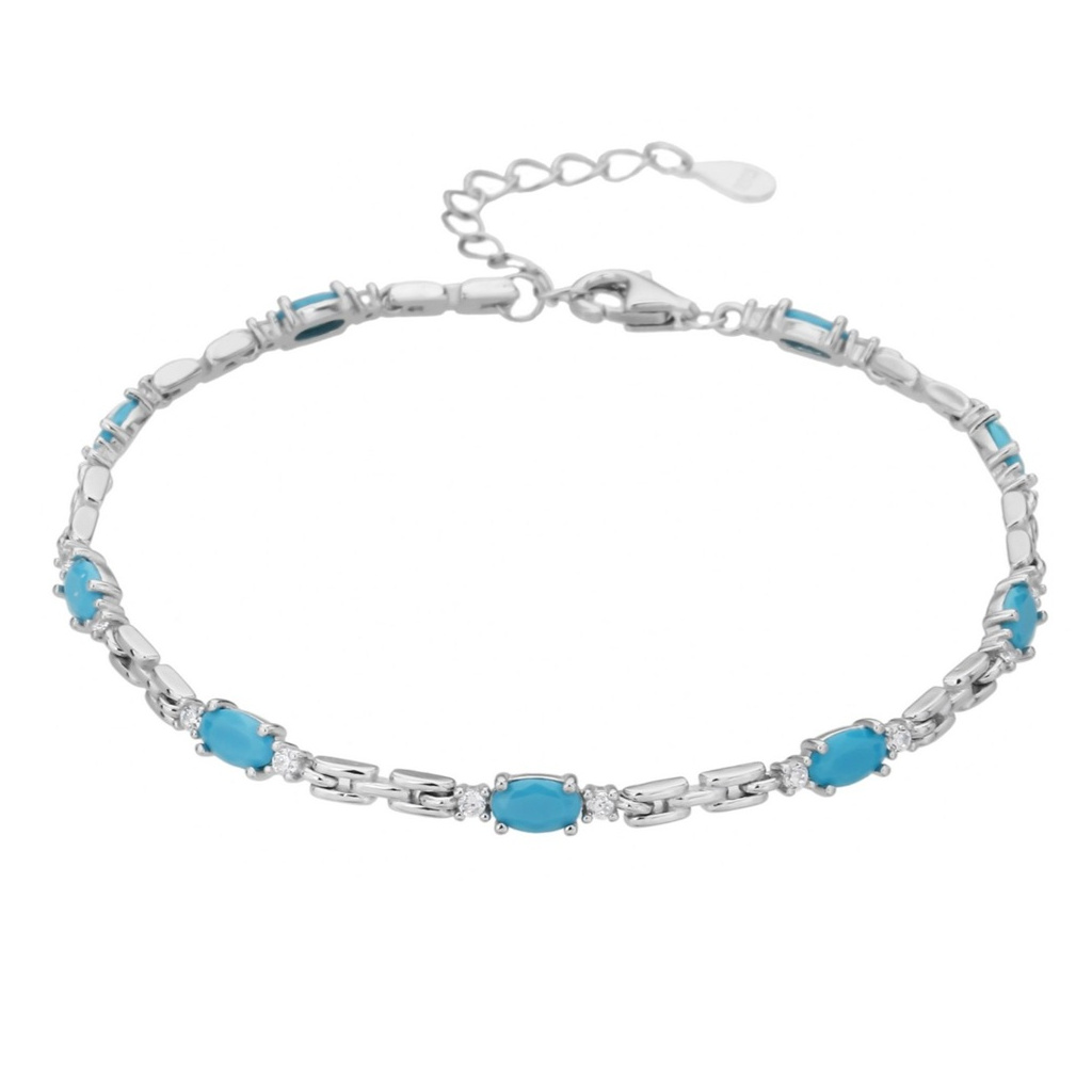 Dámský stříbrný rhodiovaný náramek zdobený mléčně modrými a čirými zirkony.