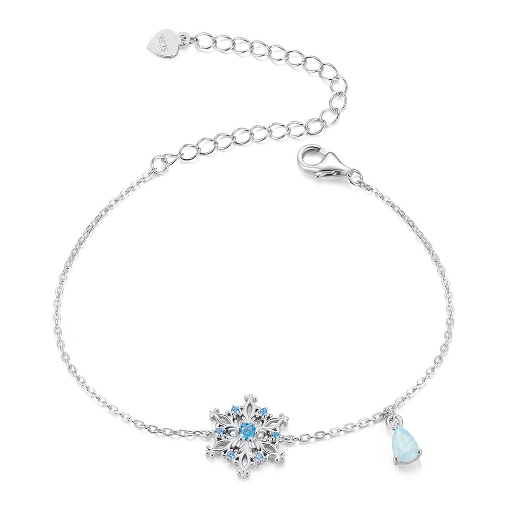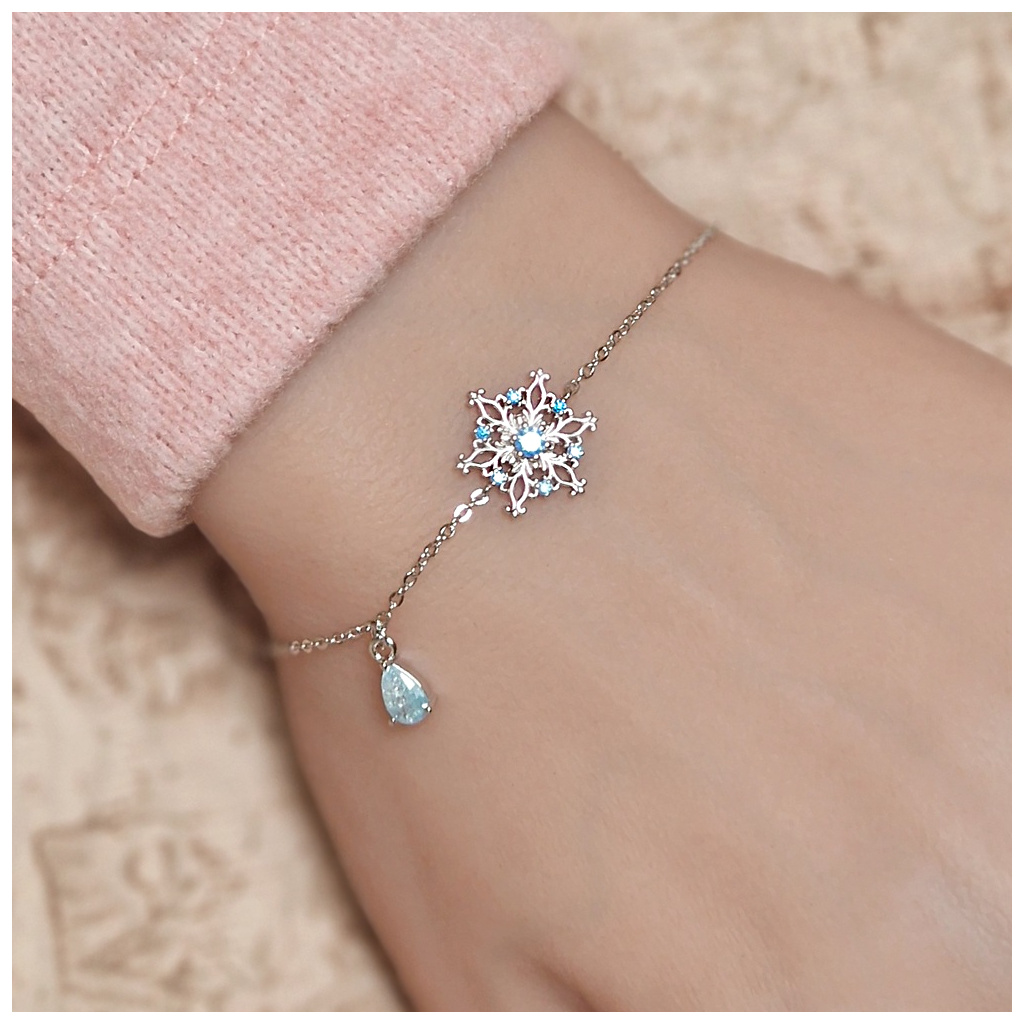 Stříbrný náramek s leštěným povrchem potažený platinou ozdobený přívěskem ve tvaru sněhové vločky. Vločka je zdobená modrými zirkony.