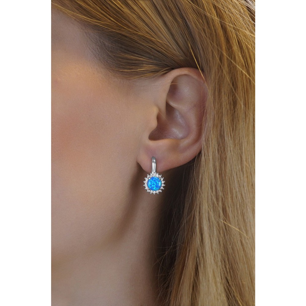 Luxusní stříbrná souprava s rhodiovanou povrchovou úpravou dekorovaná jasně modrým syntetickým opálem o průměru 7 mm a drobnými čirými kamínky kulatého brusu vsazenými po obvodu centrálního kamene.