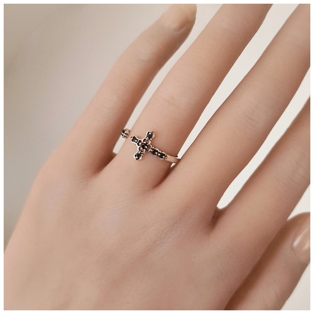 Otevřený stříbrný prstýnek s leštěným povrchem zdobený křížkem z černých zirkonů.