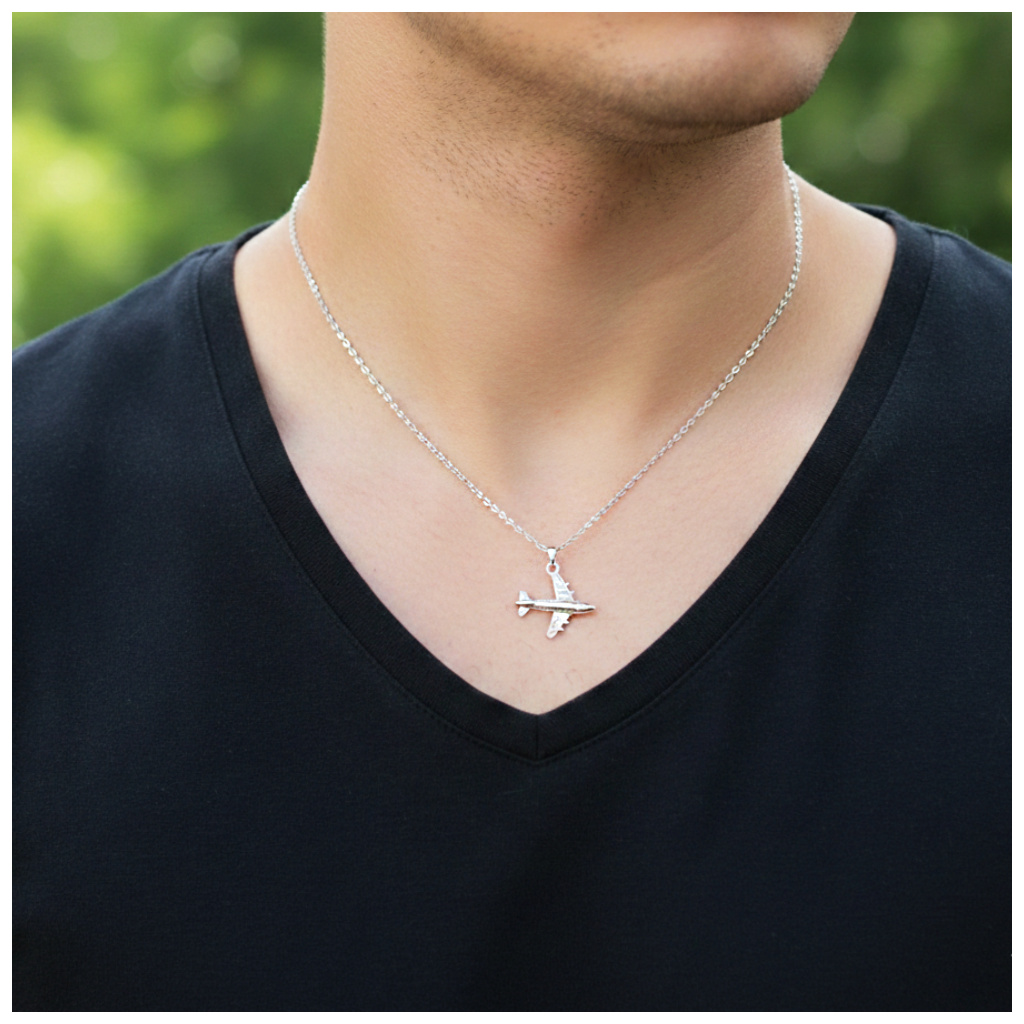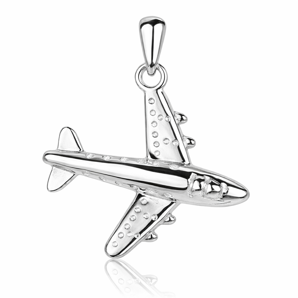 Stříbrný přívěsek s rhodiovanou povrchovou úpravou ve tvaru letadla.