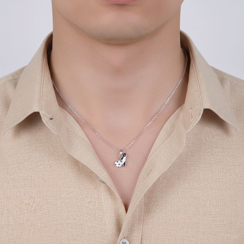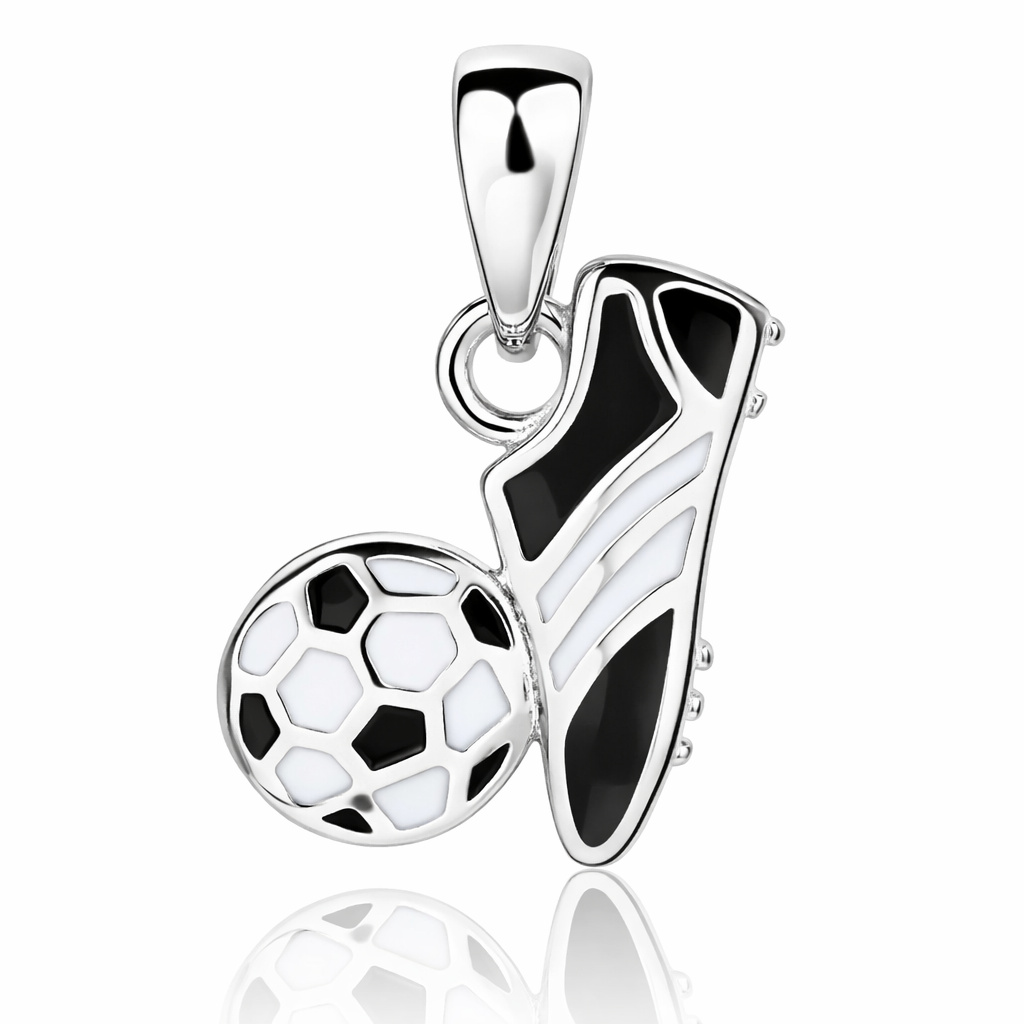 Stříbrný přívěsek s rhodiováním ve tvaru fotbalového míče a kopačky.