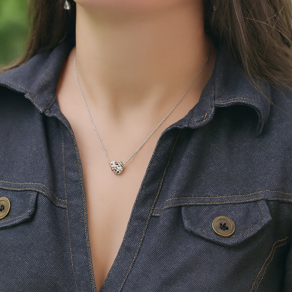 Stříbrný rhodiovaný přívěsek - korálek ve tvaru srdce s motivem růžových a bílých květů.
