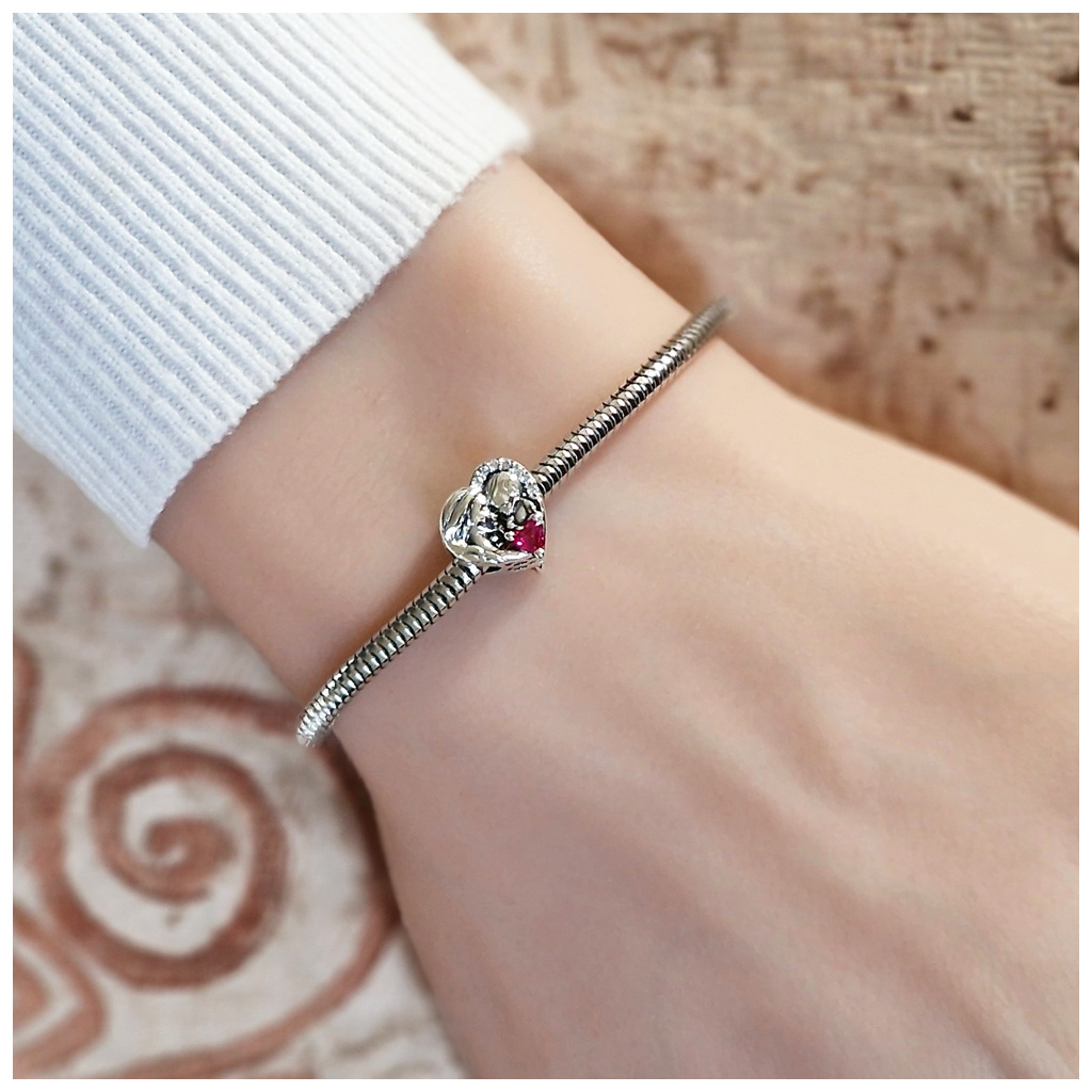 Stříbrný přívěsek - korálek s motivem matky a dítěte. Korálek je zdobený drobnými čirými zirkony a červeným kamínkem ve tvaru srdíčka.