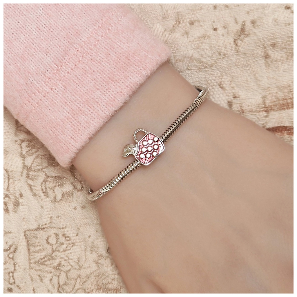 Stříbrný přívěsek - korálek ve tvaru pejska v tmavě růžové tašce. V kabelce jsou vsazeny čiré zirkony.