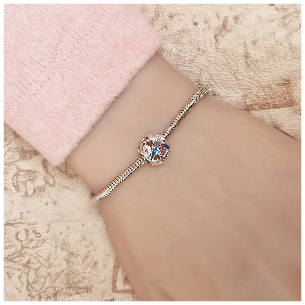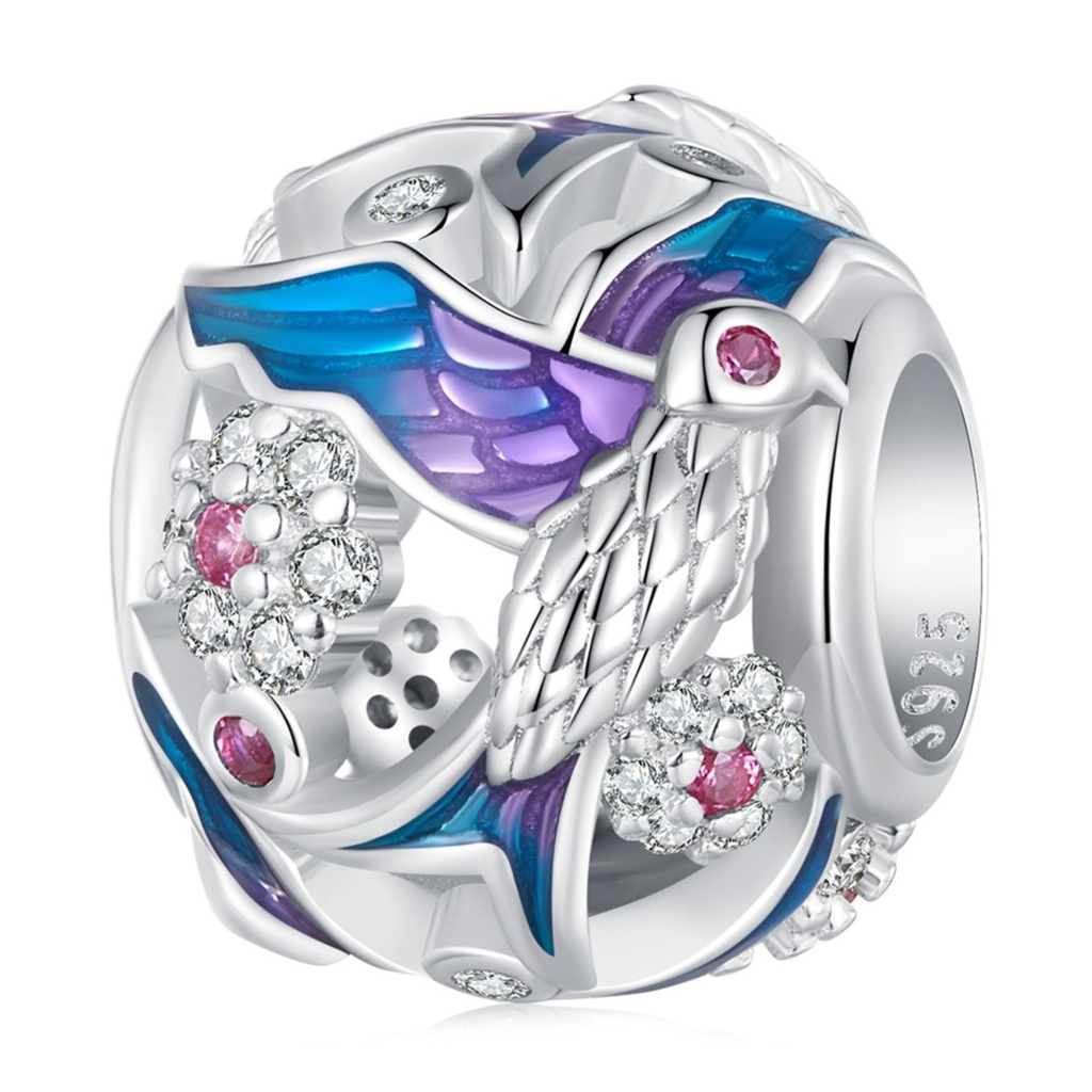 Stříbrný přívěsek - korálek ozdobený motivem barevného ledňáčka a květů. Středy květů jsou osazeny růžovými kamínky, okvětní lístky tvoří kamínky čiré.