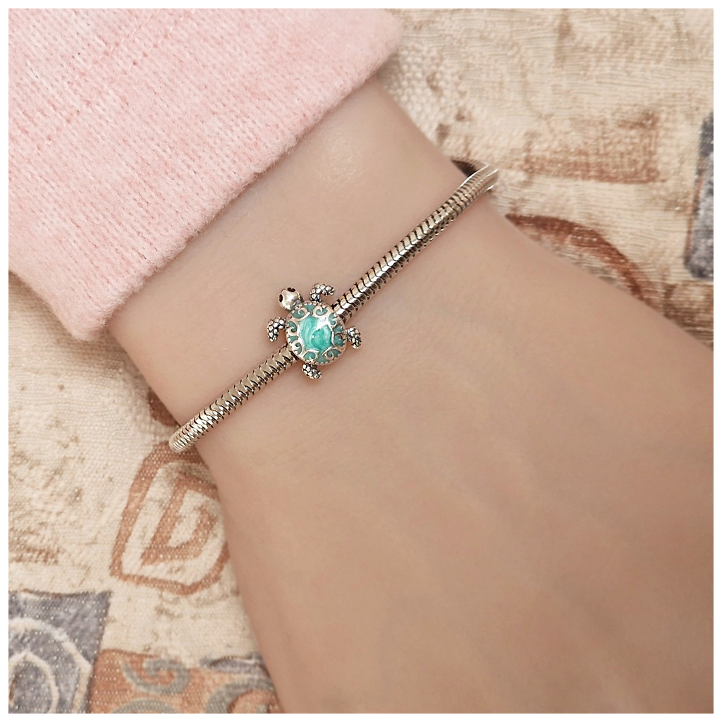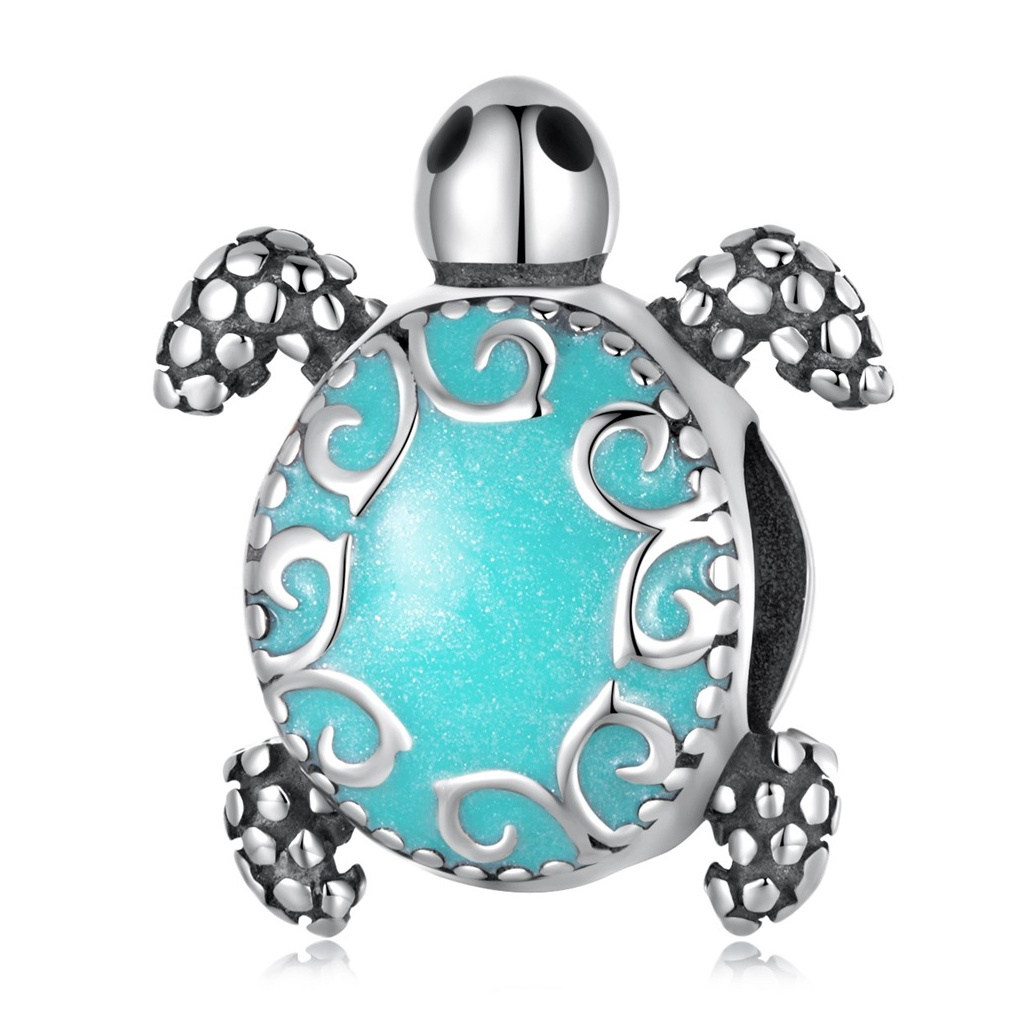 Stříbrný přívěsek - korálek ve tvaru želvy. Povrch je potažen modrozeleným smaltem.