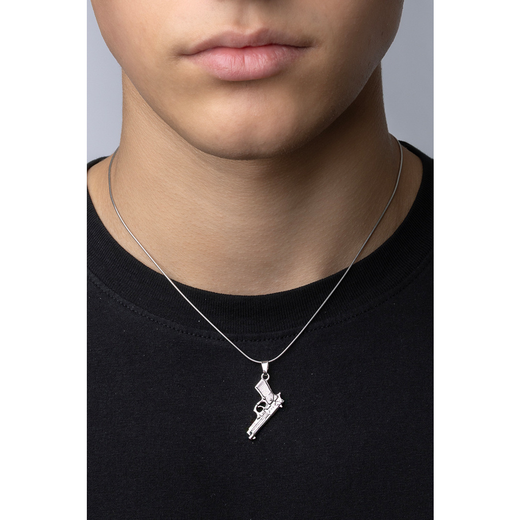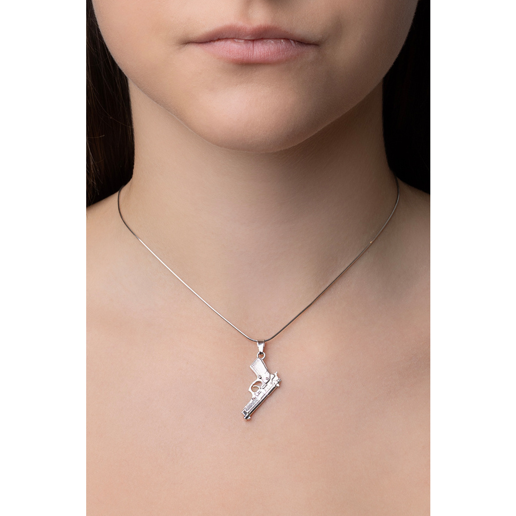 Stříbrný přívěsek s leštěnou povrchovou úpravou s rhodiováním ve tvaru pistole.