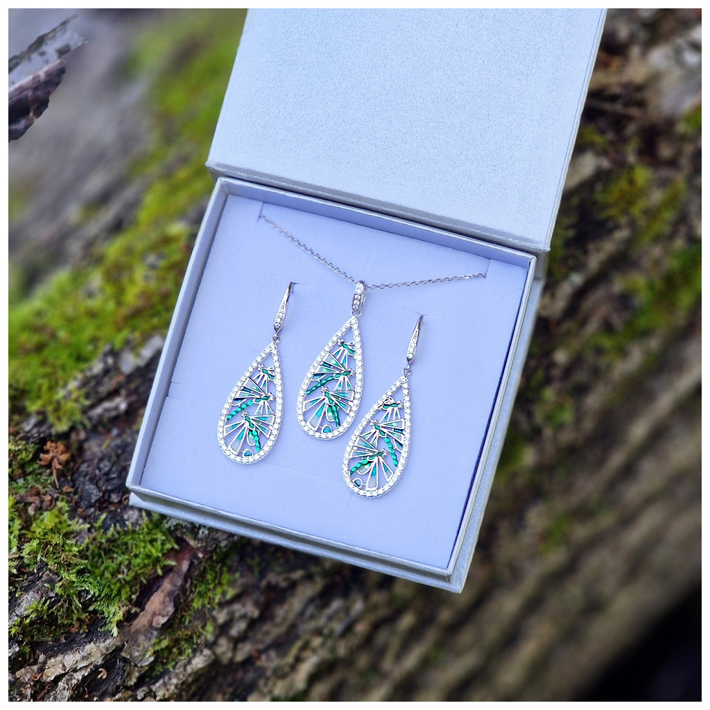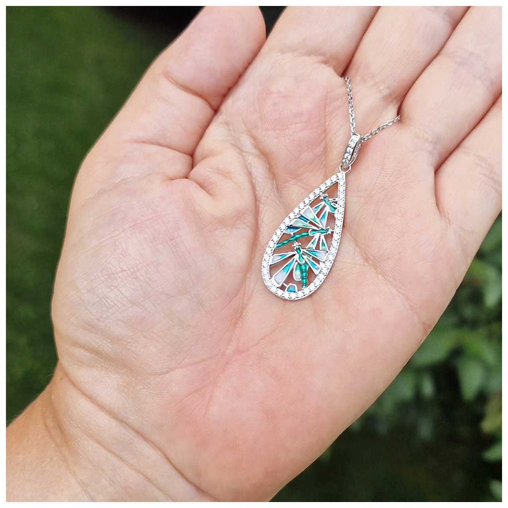 Stříbrný přívěsek s leštěným rhodiovaným povrchem s motivem vážek z modrého, bílého a zeleného smaltu a drobnými čirými zirkony.