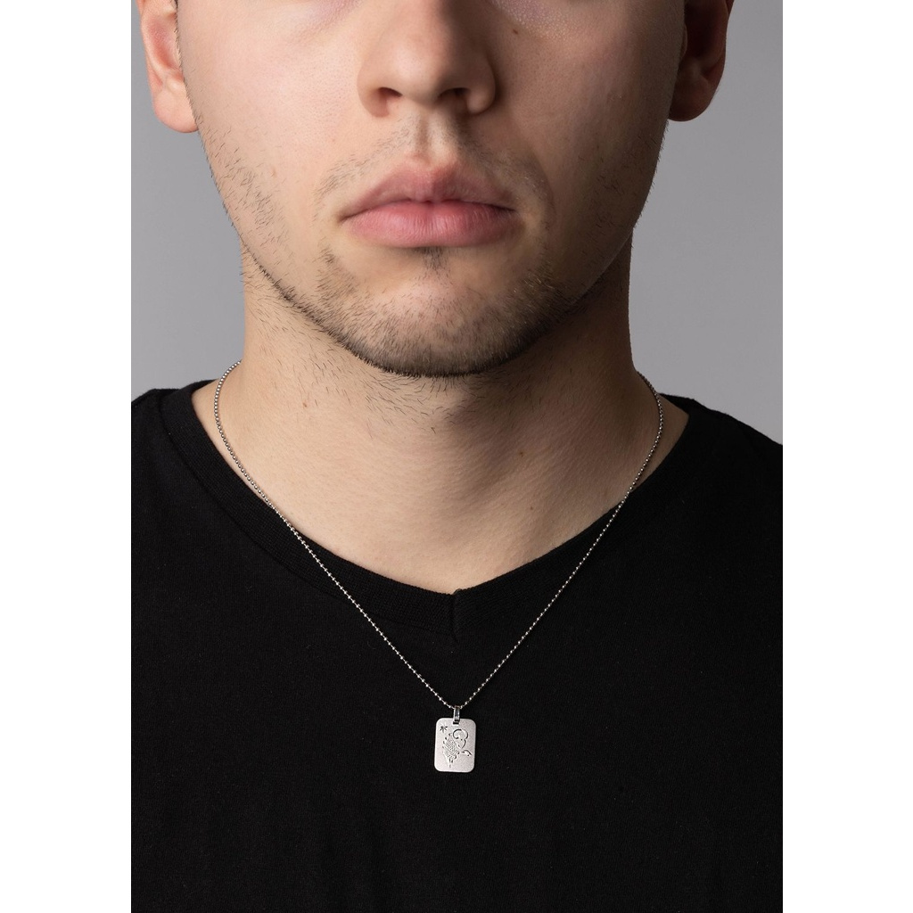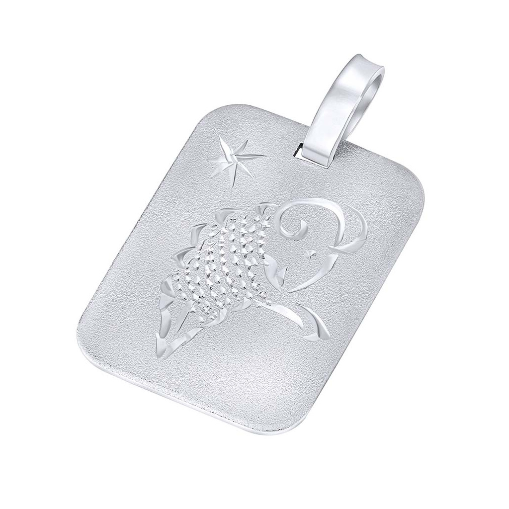 Stříbrný přívěsek znamení zvěrokruhu - Beran s rhodiovanou povrchovou úpravou ozdobený ruční rytinou Berana. Přední strana přívěsku je matovaná, zadní leštěná.