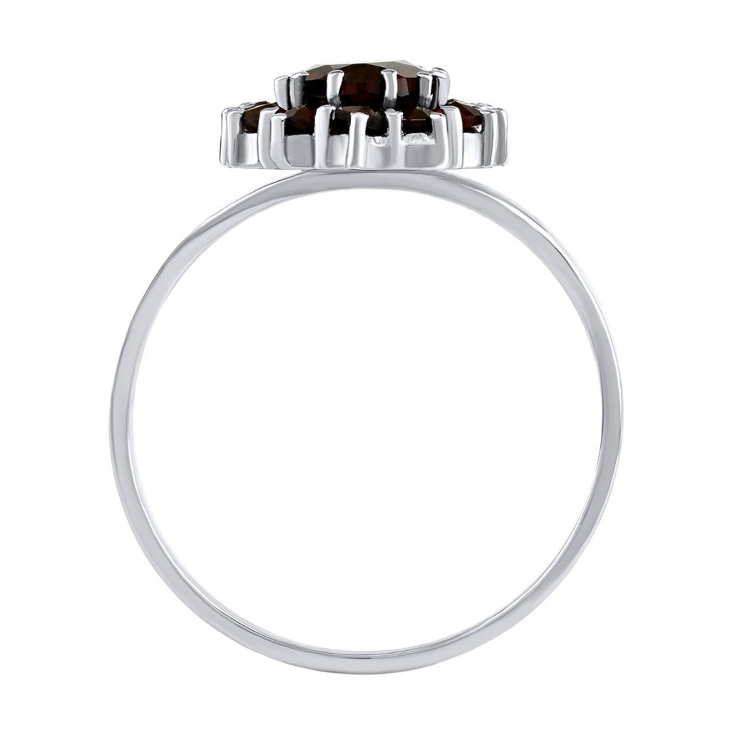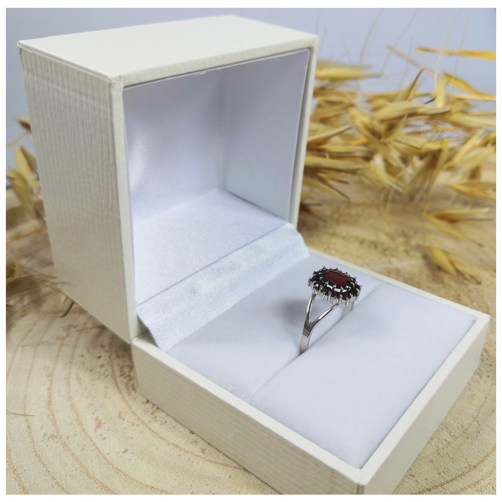 Luxusní stříbrný prsten s leštěným rhodiovaným povrchem ozdobený sytě červenými granáty a almandinem vsazeným do středu prstýnku.