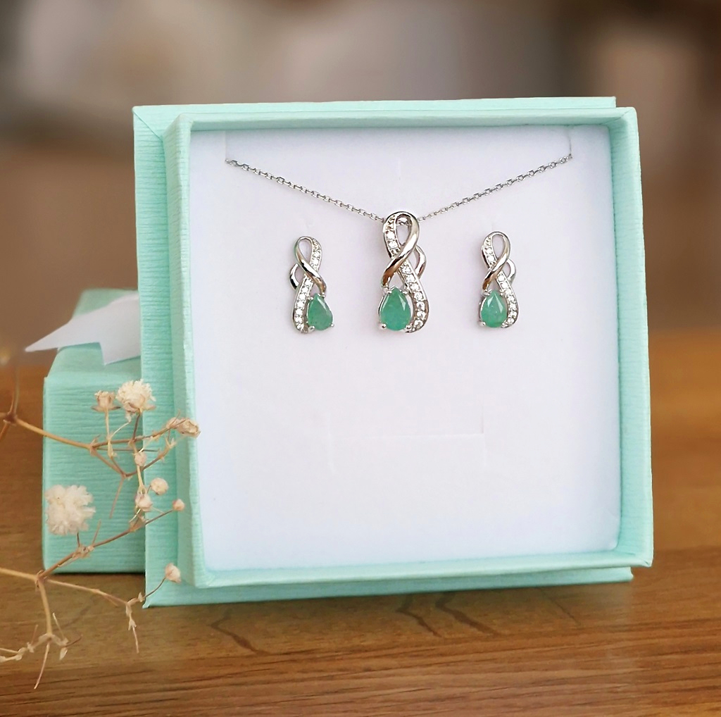 Stříbrný set šperků Estelle s pravým Smaragdem a Brilliance Zirconia - náušnice a přívěsek